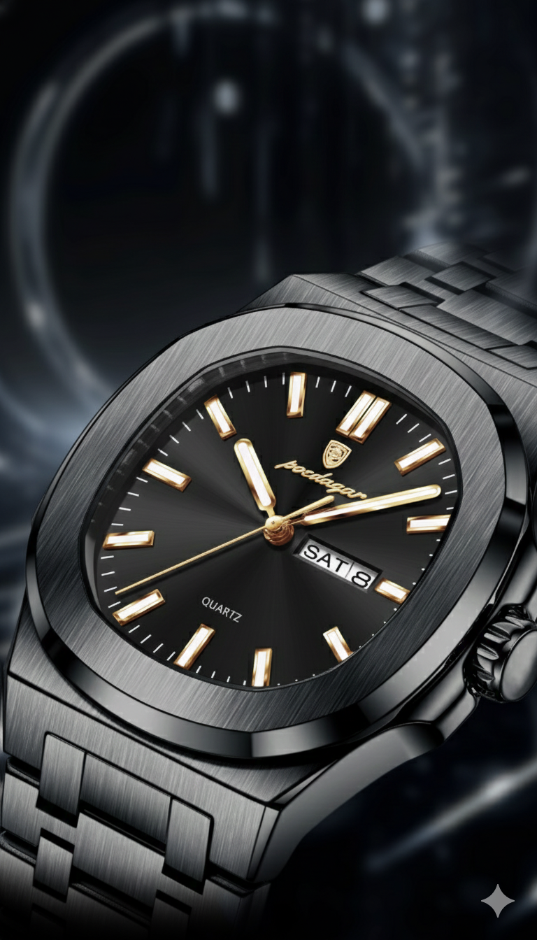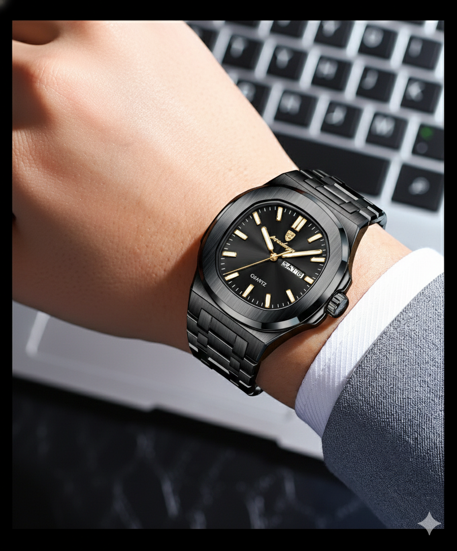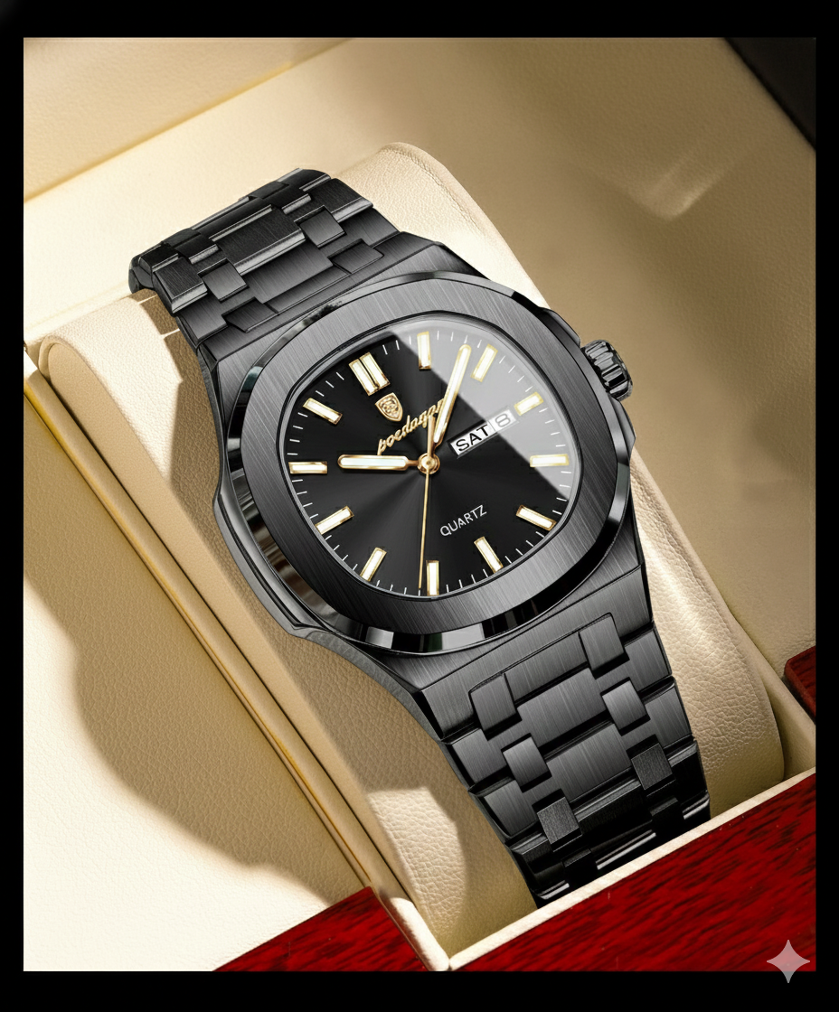 Deluxe All Black: elegância absoluta em cada segundo. Criado para homens que não seguem tendências — criam o próprio padrão.